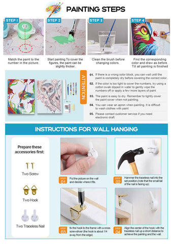 The paint by numbers contains a painting canvas , 3 brushes, DIY frame,a box of paints, and a sticker corresponding to the number, which can be used to help the consumer better find the color number of the paints needed. We also have a color card that corresponds to the color number and the order of the painting.