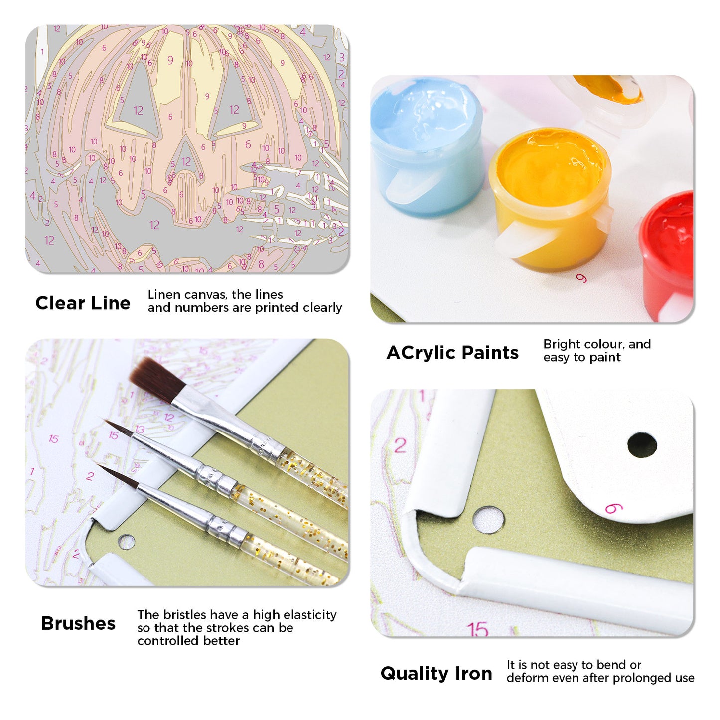 1.Numbered Paint Pots 2.Full Set of Brushes 3.Color Guide