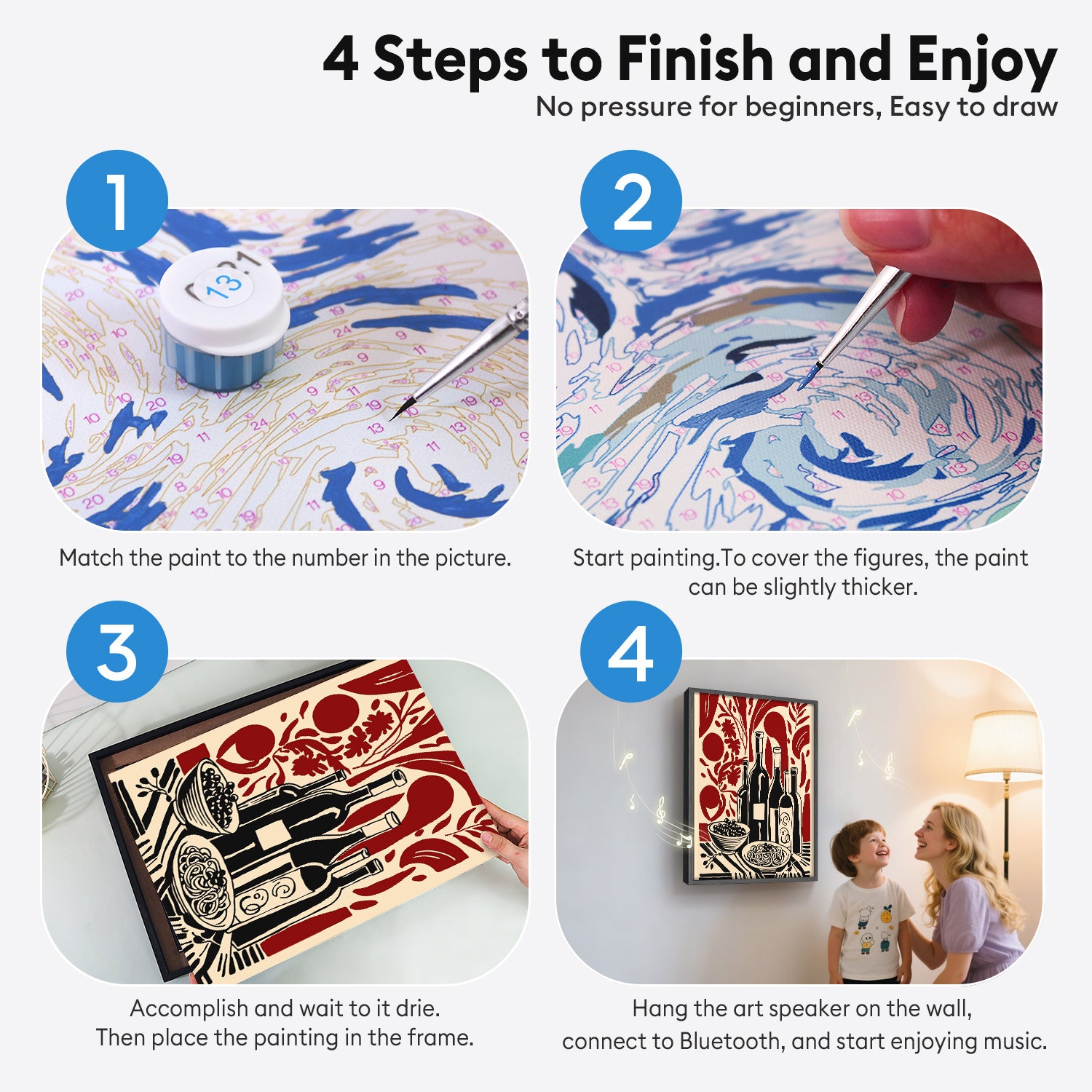 With numbered coloring and other designs, no matter your painting skills, just follow the steps and you'll create a beautiful piece you'll want to show off. Easily master your artistic sense. One set of oil painting supplies, it's all here! Order once and start your creative journey.
