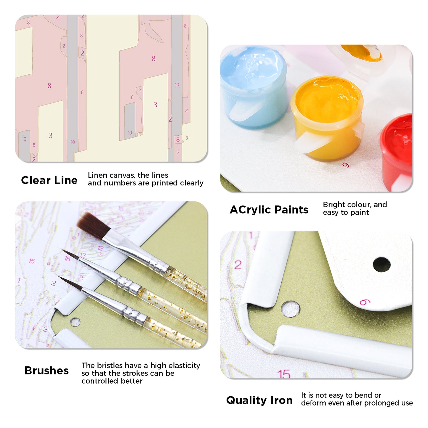 1.Numbered Paint Pots 2.Full Set of Brushes 3.Color Guide