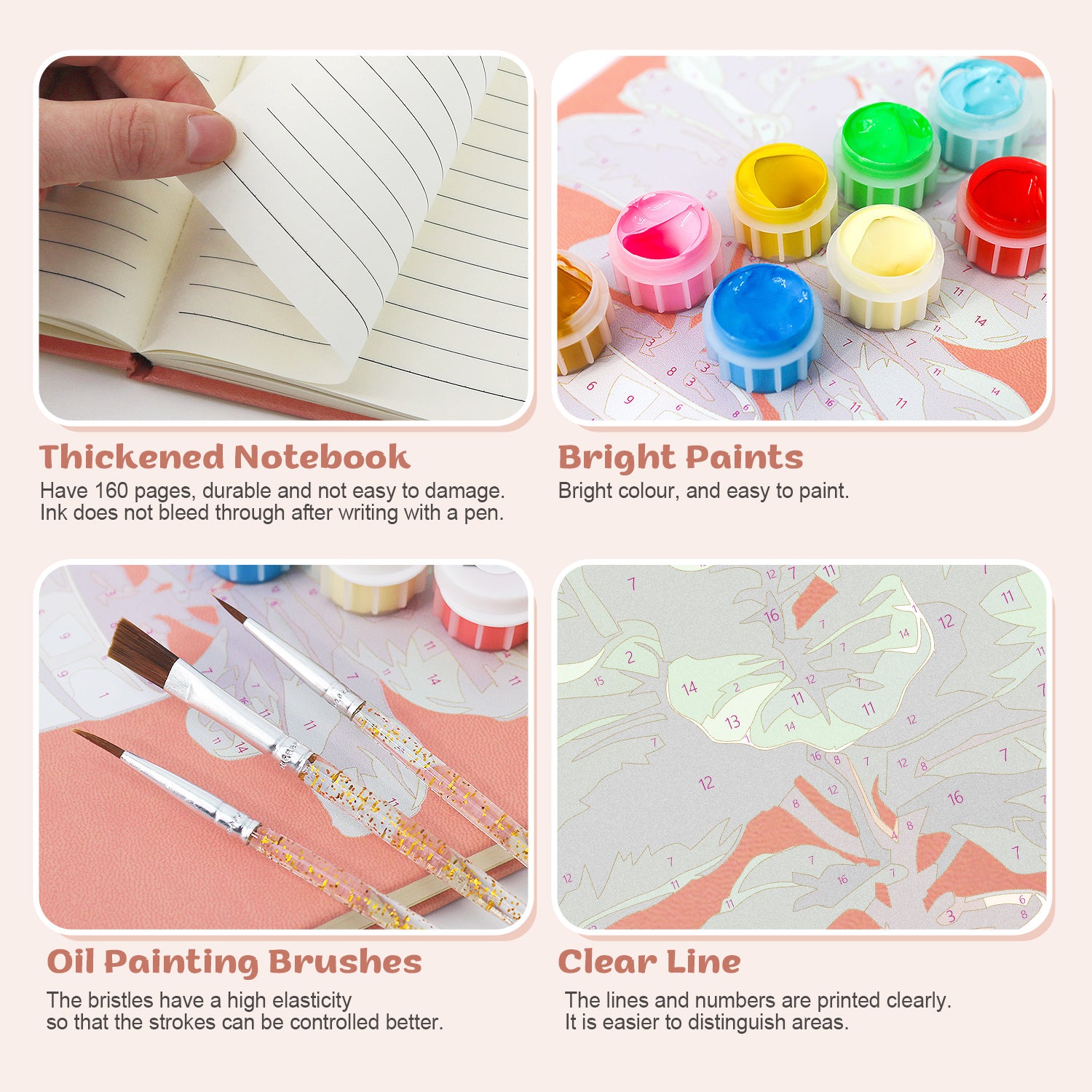 1.Numbered Paint Pots 2.Full Set of Brushes 3.Color Guide