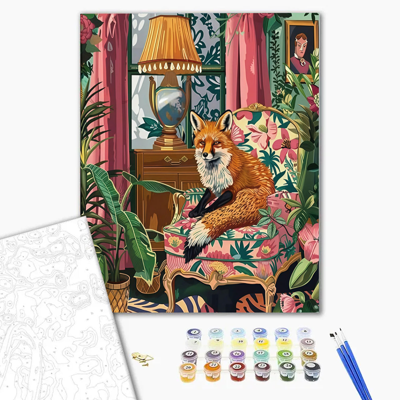 (2) You will receive a ready-to-use kit containing the canvas with the numbered areas, the numbered pots of paints, paint brushes, and a picture of the expected result to guide you. Let the journey begin!