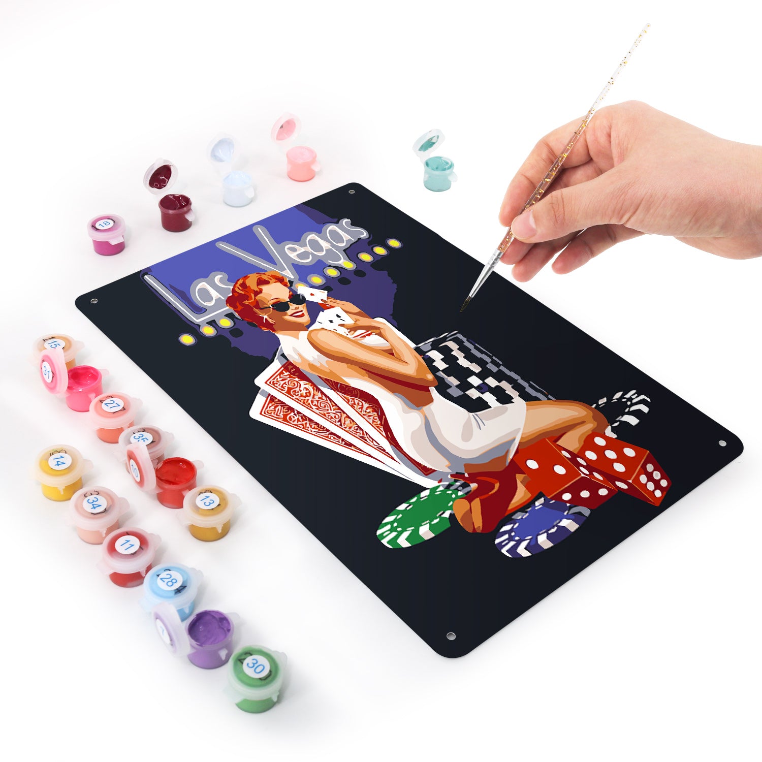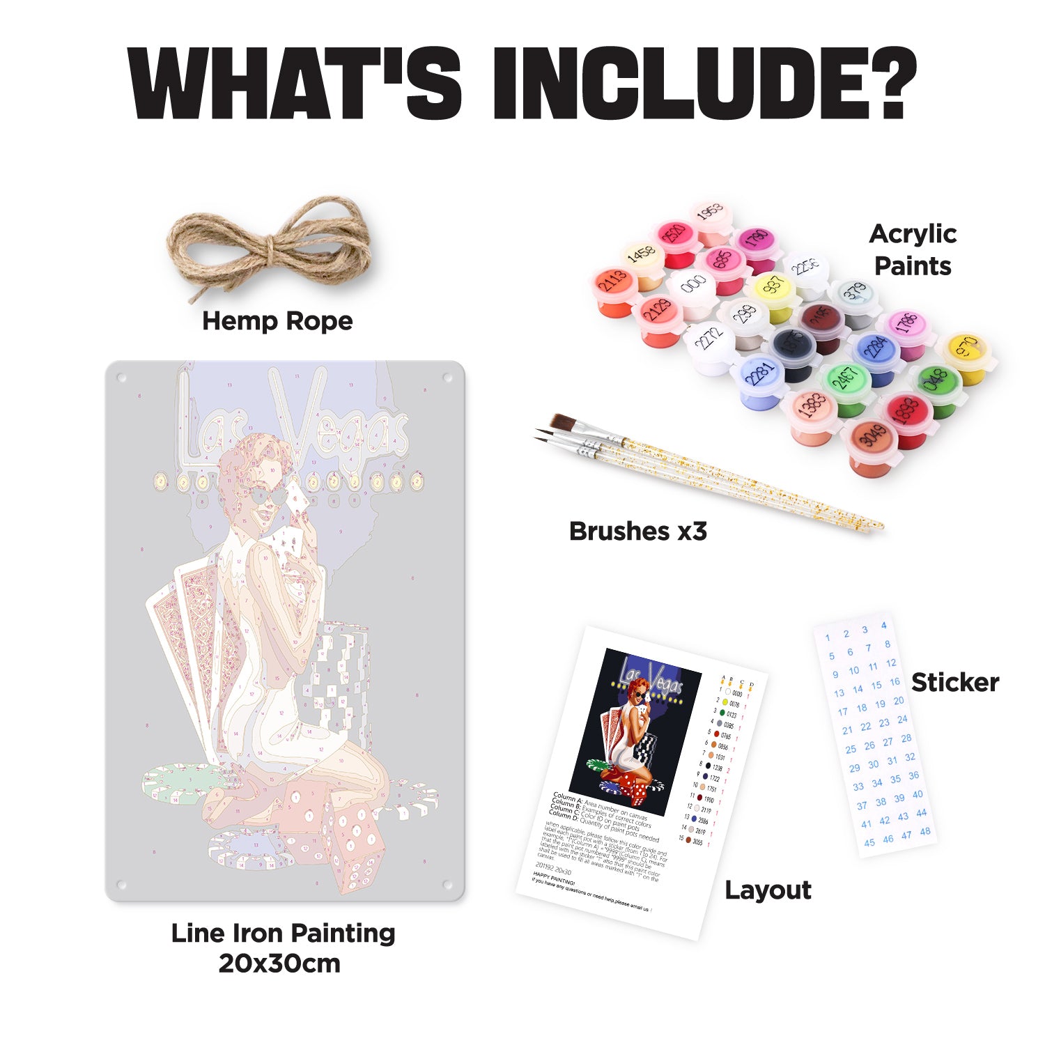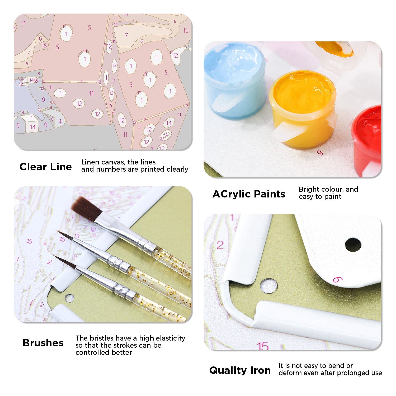 1.Numbered Paint Pots 2.Full Set of Brushes 3.Color Guide