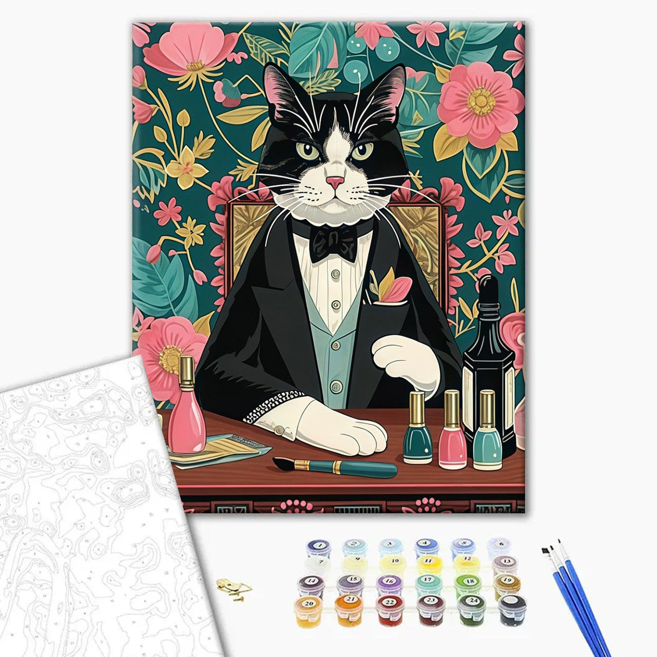 (2) You will receive a ready-to-use kit containing the canvas with the numbered areas, the numbered pots of paints, paint brushes, and a picture of the expected result to guide you. Let the journey begin!