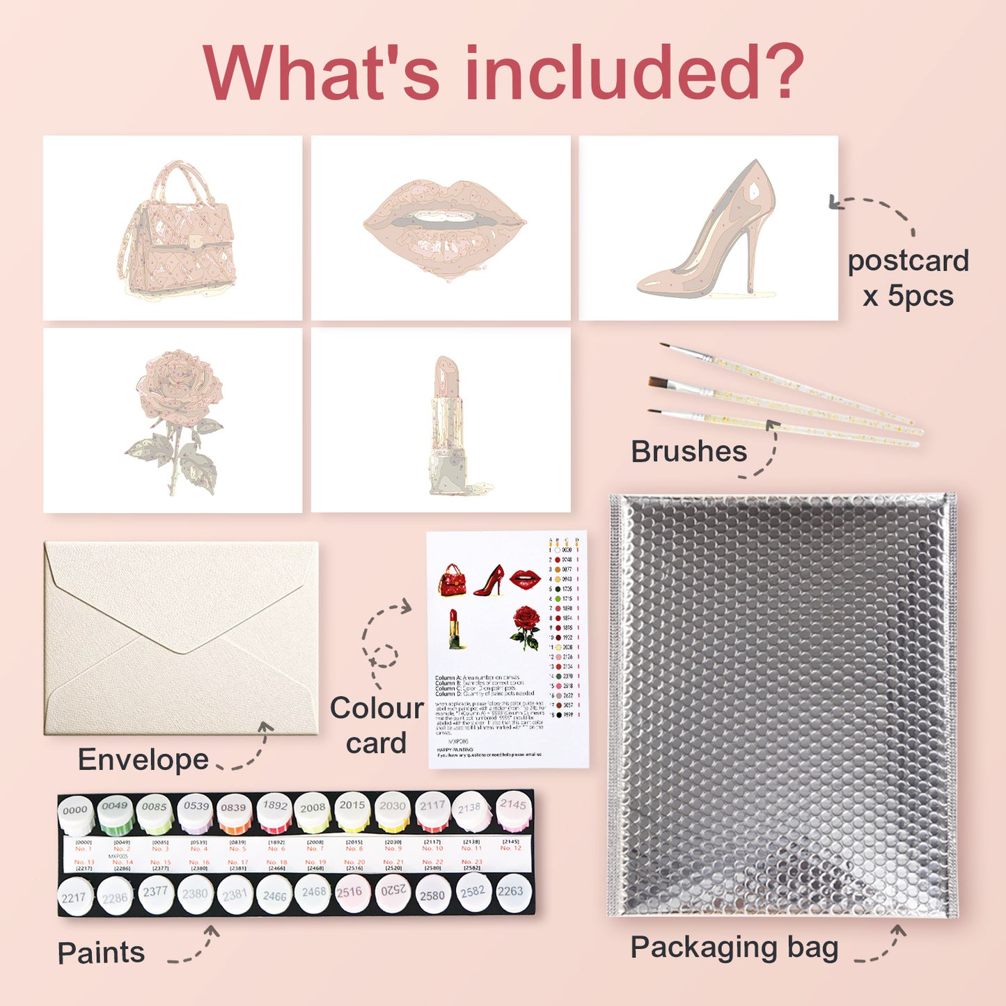1.Numbered Paint Pots 2.Full Set of Brushes 3.Color Guide