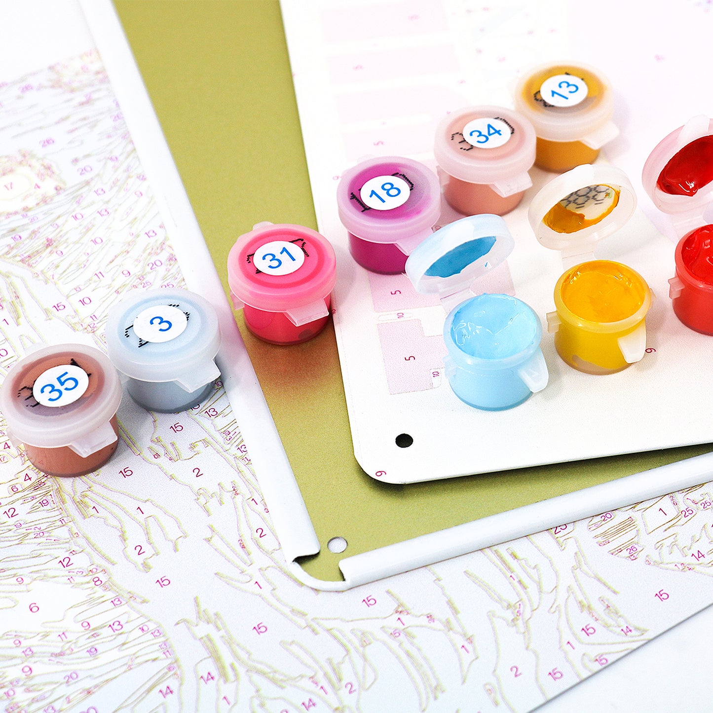 1.Numbered Paint Pots 2.Full Set of Brushes 3.Color Guide