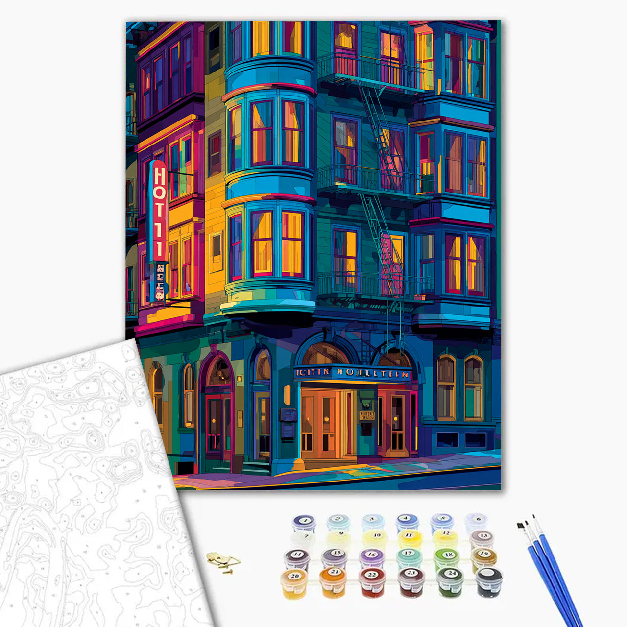 (2) You will receive a ready-to-use kit containing the canvas with the numbered areas, the numbered pots of paints, paint brushes, and a picture of the expected result to guide you. Let the journey begin!